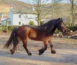 To describe this working pony lets start on ground level with the feet: They are broad and open at the heel, so they can cover boggy ground without sinking into it. They have characteristic feather on the fetlock and heel that protects the lower leg from mud and thorns etc. They have a short cannon bone; this makes the legs very strong and powerful so they can work up and down hills happily all day without any unnecessary stresses and strains to the flexibility of their joints, (the legs and the feet are the most important part to the working pony). Chest: Broad with good width for the heart and lungs. Legs set at four corners for the greatest stability and sore footedness and balance. Body: Well sprung ribcage, powerful elbows and second thigh, strong rounded solid buttocks with will set on tail. Curvaceous withers. A fairly broad back, with plenty of muscle to cover. Neck: Well proportioned with a good length of rein. Head: Showing pony qualities with small alert ears, large intelligent eyes, wide nostrils. Overall displaying a kind but intelligent temperament. Like any other working horse or pony the Fell Pony needs feeding good quality food when in work. Of course when out on the Fell Mountains in their semi wild state they roamed large areas of Fell top, and in some harsh winters it was survival of the fittest. But these working ponies were valuable to the Lakeland farmer, so were watched over and fed accordingly with the other farm stock in the winter. A large quantity of thick mane and tail and coarse body hair in the winter meant the pony was cold and under nourished. When in good condition their rounded ribcage should be nicely covered with muscle, and no ribs showing, and likewise good muscles on the shoulder and flanks. Their point of draught being low to the ground, so producing great strength for their size.